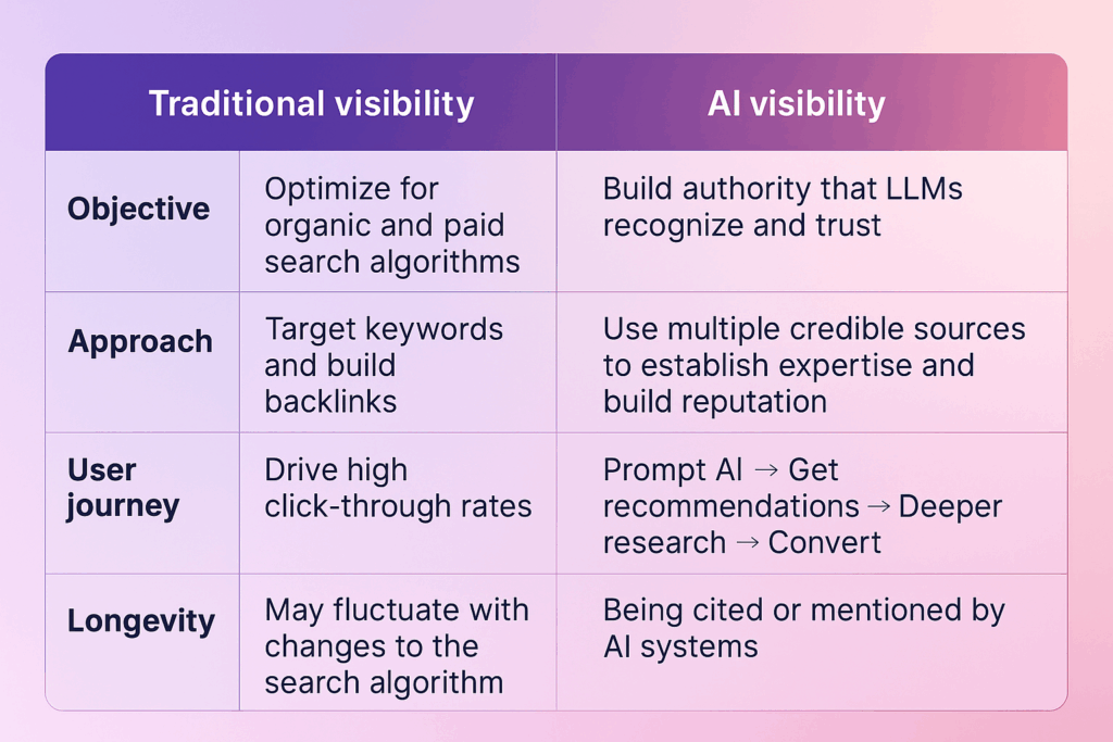 Showing up in AI search results provides a competitive advantage to brands that are mentioned. But optimizing for AI algorithms brings a ton of changes to your visibility playbook. Namely: